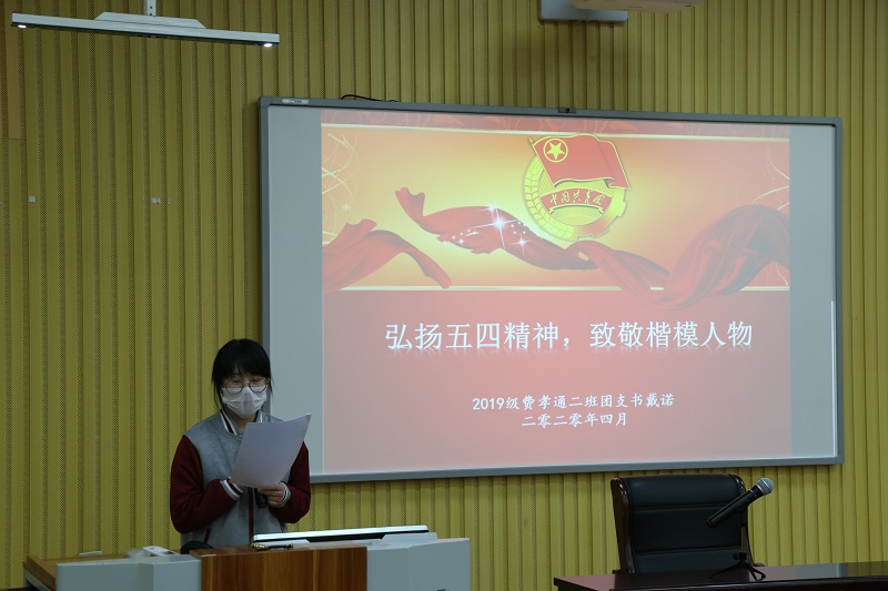 2019级费孝通(2)班团支书戴诺同学为大家带来了《致敬蔡元培先生》的主题演讲。戴诺同学为大家讲述了“北大之父”蔡元培先生与“五四运动”不得不说的动人故事。