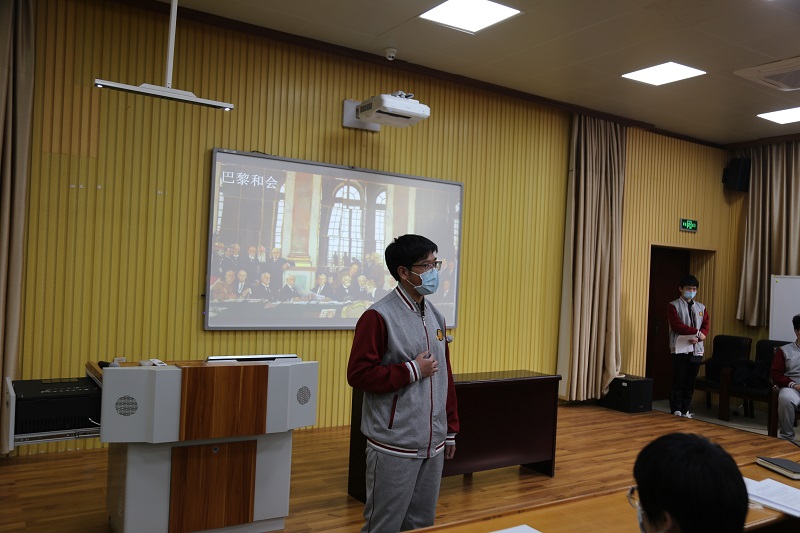 第一次世界大战期间,巴黎和会上中国外交失败了。1919年5月4日,在北京发起了一场以青年学生为主,广大群众、市民、工商人士等阶层共同参与的爱国主义运动。为了再现这段波澜壮阔的历史,青年团员陈子烨同学、赵家柱同学、吴迪同学、周佳希同学表演了“巴黎和会”的话剧片段。中国代表的一句“中国不能失去山东,就像西方不能失去耶路撒冷”让全场沸腾,“五四”英雄楷模的大义凛然感动着每位观众,历史的残酷燃起了青年团员的爱国热情。