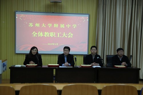 (苏附网讯) 2019 年 1 月 25 日,苏大附中召开了期末总结大会。在砥砺奋进的 2018 年里,苏大附中有所思、有所成。学校获得了“省级教师发展示范基地校”、“江苏省中小学智慧校园先进学校”、“园区教育工作先进单位”等荣誉称号。赵光义校长回顾了 2018 年苏大附中取得的各项成绩,并对此给予充分的肯定。他表示,苏大附中的大家庭历来团结奋进,互帮互助,这种和谐向上的教育生态环境是学校发展的强大支撑。成素萍副校长在主持中表示, 2018 年是苏大附中发展变化的重要转折点,学校的各条线都有综合荣誉,成果丰硕,这是全体苏附人奋发进取的成果。卜祥玉副校长宣读了“校先进工作者”、“优秀班主任”、“优秀集体”的表彰决定,并号召大家向他们学习,上下一心,同心协力,共同推动苏大附中的发展。