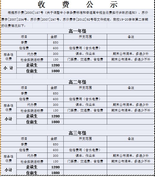收费说明 来源: 发布时间:2020-11-12 00:00:00 浏览次数: 次 【字体:小 大】 苏大附中严格按照上级教育主管部门的收费政策规范收费。为了更透明地执行规范收费政策,学校财务处和德育处事先筹划,根据上级学期收费规定,于开学前拟定告家长书,将相关的收费事项和标准、相关文件件号等以告家长书的形式发放给每一个学生和家长,班主任和财务室也不直接经手财物,由学生在建行卡上进行自行缴费。征订教辅材料也是由教务处扎口,严格执行一教一辅政策。学校除了上级规定的收费项目外,没有收取任何的其他费用。2020.10 分享到: 【打印正文】
